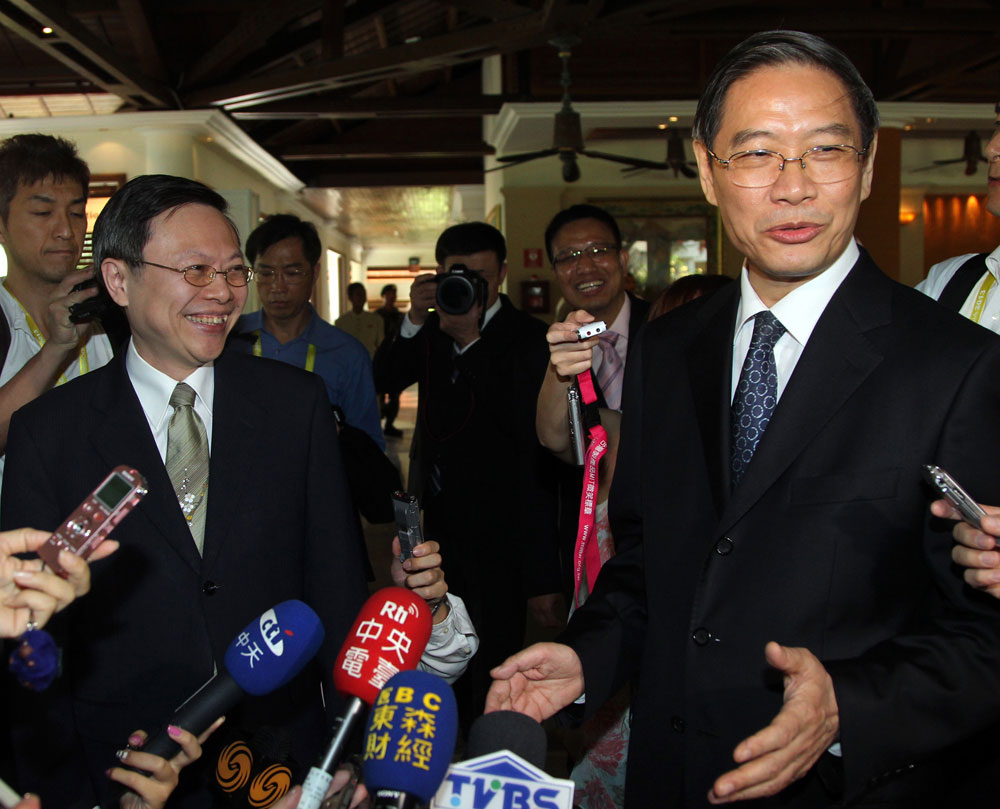 2013年亚太经合组织峰会(APEC)间隙,国台办主任张志军与台湾陆委会负责人王郁琦会面寒暄。
