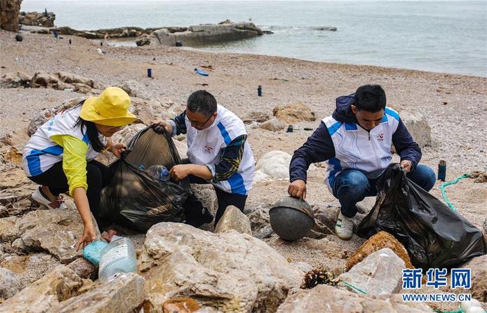 6月4日,志愿者在山东省荣成市海驴岛的沙滩上捡拾垃圾。新华社发(李信君 摄)