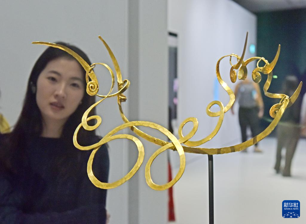 4月14日,媒体记者在拍摄哥伦比亚头饰。新华社记者 陈铎 摄