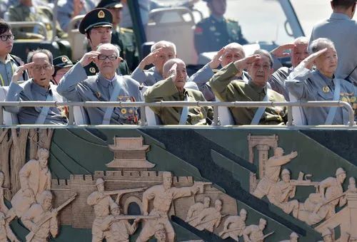 2015年9月3日,中国人民抗日战争暨世界反法西斯战争胜利70周年纪念大会在北京隆重举行。这是抗战老兵乘车方队。新华社记者 罗晓光 摄