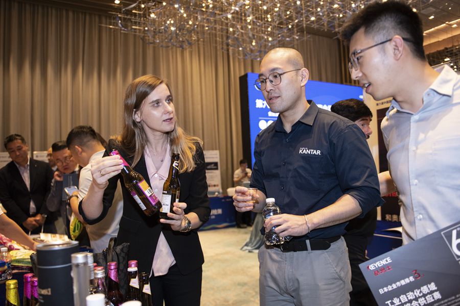 在深圳举行的进博会展前供需对接活动上,波兰投资贸易局的工作人员(左前)向采购商展示风味啤酒(2023年8月29日摄)。