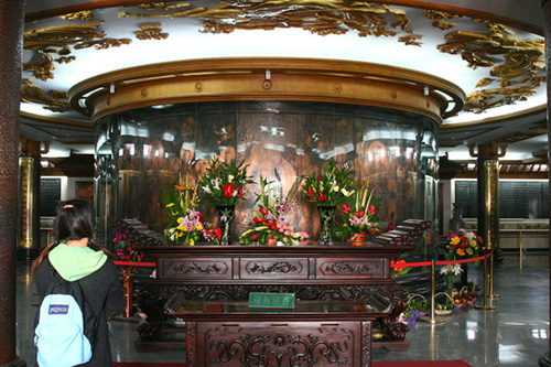 功德厅的顶层是五百观音厅。厅中供奉有500尊妙相迥异的紫铜观音宝像,中间的大圆柱刻绘的是释迦牟尼佛说法图。