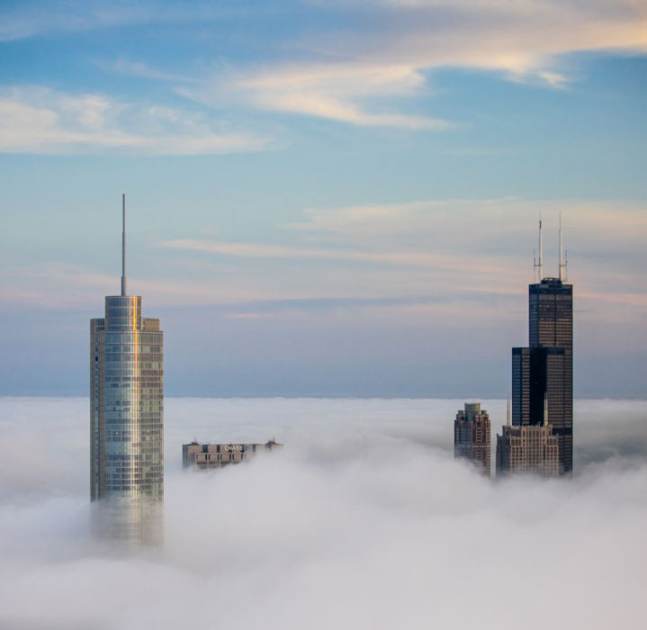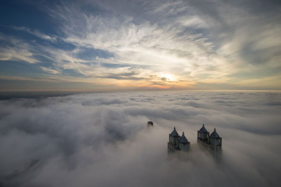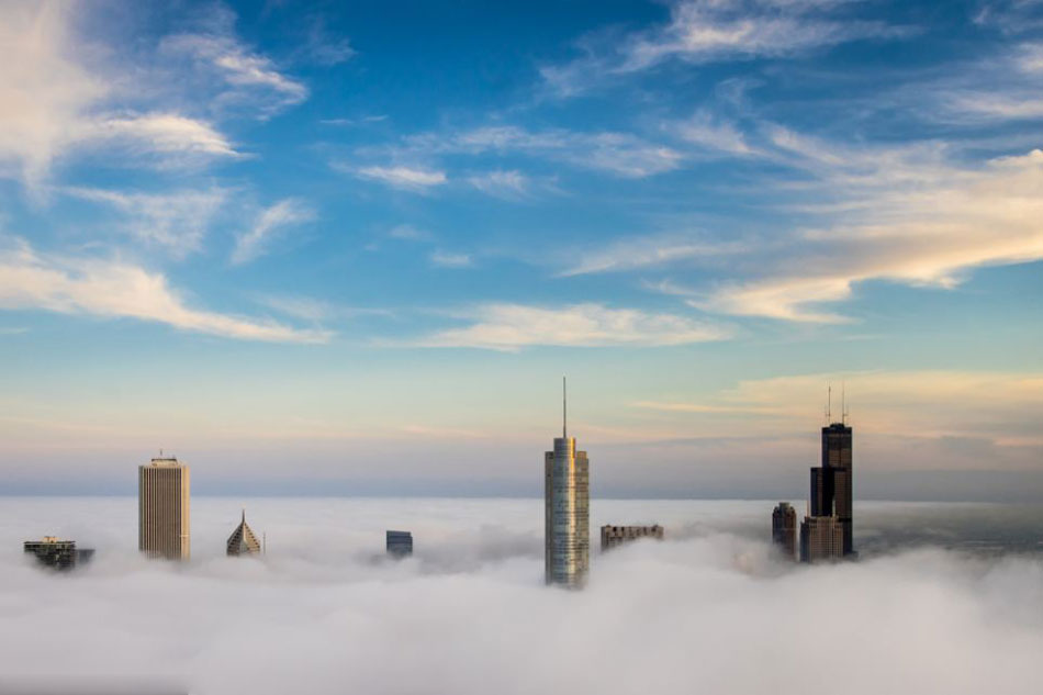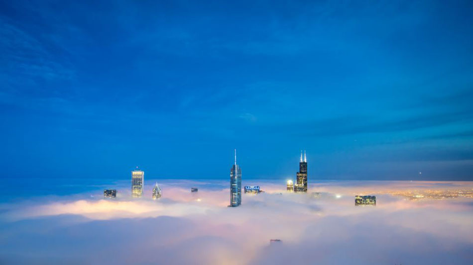 蔡在距地面1000英尺(约305米)的汉考克天文台拍摄下这组照片,图片中,整座城市消失在浓雾中,包括著名的威利斯大厦在内的几座摩天大楼直插云霄,云层上方在城市灯光的掩映下景色壮丽,如入仙境。蔡是一位业余摄影师,平日他在IT界工作。蔡介绍说他差一点错失了记录下这一奇景的机会,“当时我刚结束工作从亚洲回来,开车的路上注意到大雾从湖边慢慢移动而来,所以我决定赌一把,到天文台上去看看。”