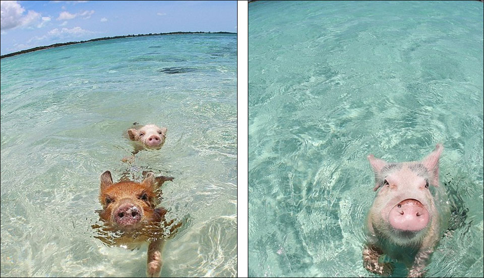 这些猪可能是路过水手遗弃的,曾是他们的食物来源。抓拍“游泳猪”的水下摄影师埃里克·郑(Eric Cheng)说:“由于当地人会坐船带来食物,这些猪看到船舶会下水并游向船舶,好像在欢迎和问候来者一样。看到猪在热带白色沙滩上玩耍已经很怪异,而看到他们下水迎接新来的船显得更加怪异。”