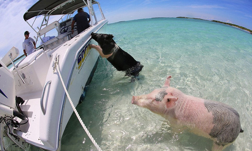这些猪非常喜欢沿着海岸在水中冲浪,它们对乘船到来的游客给与热情欢迎,并因此成为当地新的旅游看点。