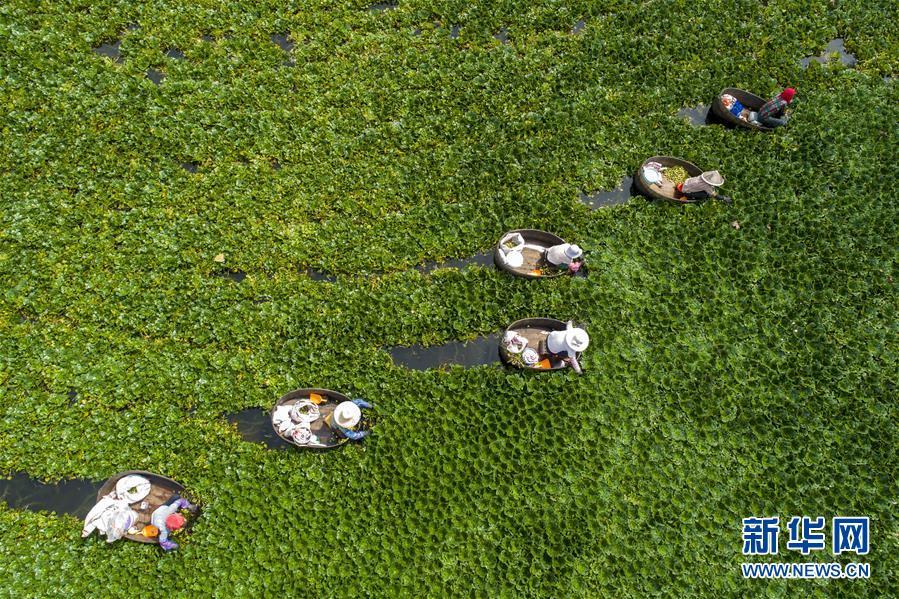 8月2日,南舍村村民划着菱桶采摘菱角(无人机照片)。盛夏时节,江苏省泰州市农业开发区南舍村的菱角进入成熟季,村民忙着采摘菱角,成为水乡特有的丰收景象。新华社发(汤德宏摄)