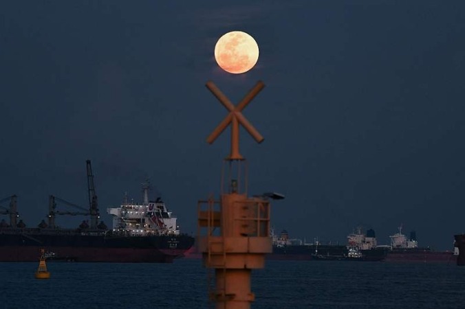 当地时间6月14日,印度孟买,当地夜空升起一轮满月。
