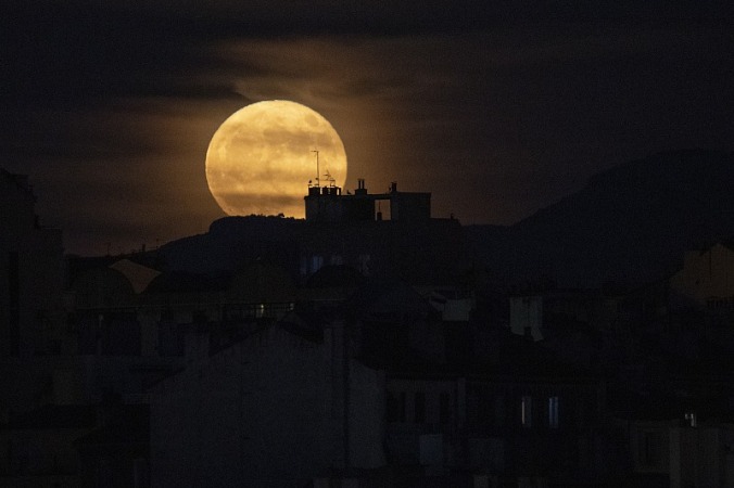 当地时间6月14日,法国马赛,夜空中拍摄的一轮“超级月亮”。
