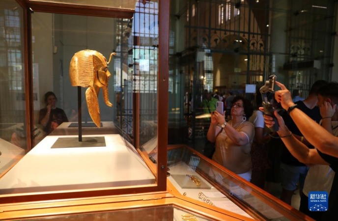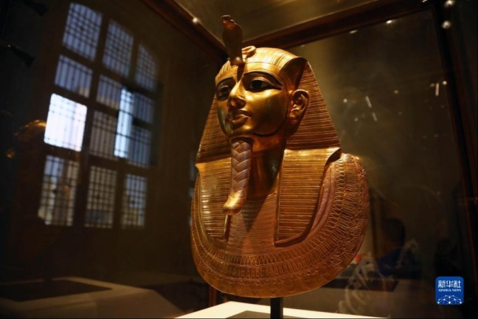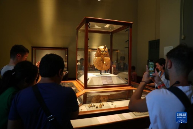 10月5日,在位于埃及开罗的埃及博物馆,游客拍摄法老苏瑟奈斯一世的金面具。新华社记者 隋先凯 摄