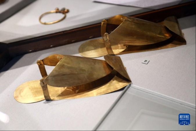 这是10月3日在位于埃及开罗的埃及博物馆拍摄的法老苏瑟奈斯一世的一双金质鞋。 新华社发(艾哈迈德·戈马摄)