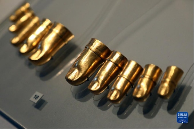 这是10月3日在位于埃及开罗的埃及博物馆拍摄的金质脚趾套。 新华社发(艾哈迈德·戈马摄)