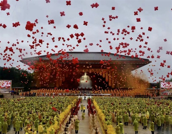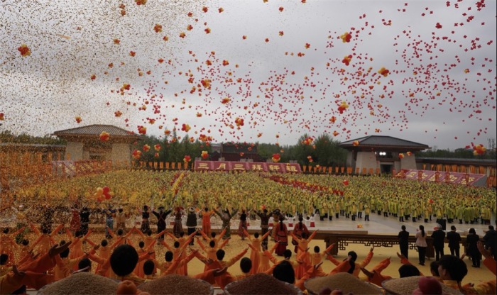 天地人和。拜祖广场上,和平鸽展翅高飞,礼赞和平;数万个气球升上天空,放飞心愿;巨幅红底黄字“天地人和”渐渐呈现,表达着对轩辕黄帝的敬仰和对中华民族伟大复兴、对世界和平和睦和谐的美好祝愿。