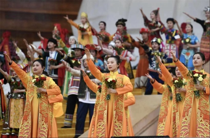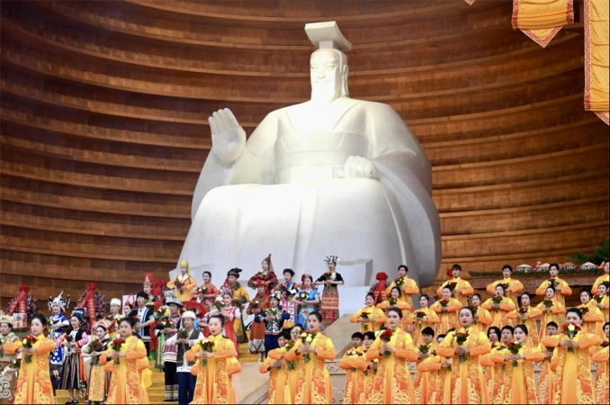 高唱颂歌。“大风起兮云飞扬,吾土吾心吾欢畅,四海之内皆和谐,吾思吾梦吾向往……”来自香港、台湾、澳门和内地的歌手与56个民族的演员以及少年儿童合唱团、百名混声合唱团共同高唱《黄帝颂》,体现炎黄子孙虔诚之心、恭敬之意。