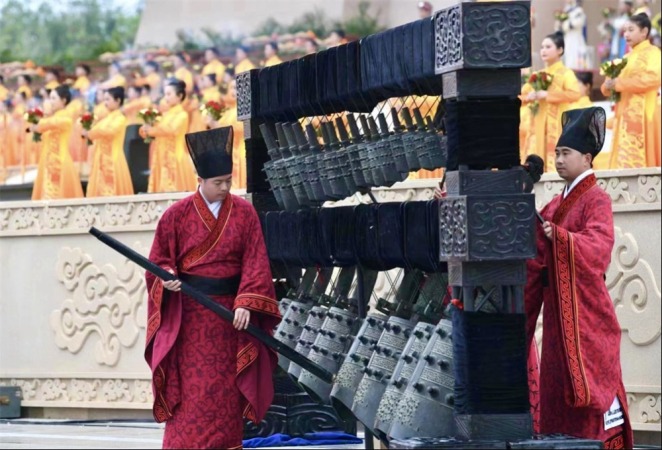 行施拜礼。现场人员面向黄帝像,深深三鞠躬,表达炎黄子孙对文明始祖的无限尊崇。