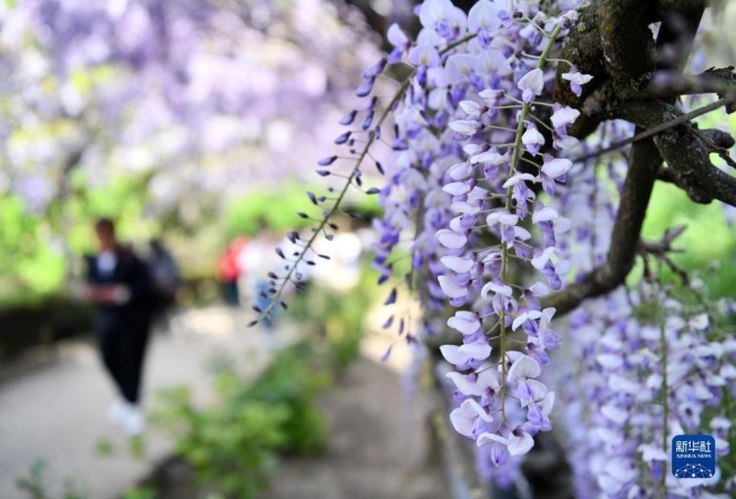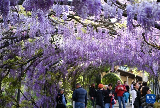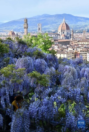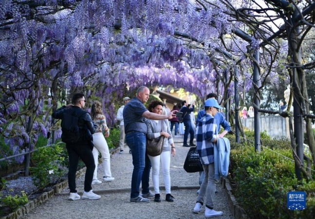 4月24日,在意大利佛罗伦萨,游客欣赏紫藤花。新华社记者 金马梦妮 摄