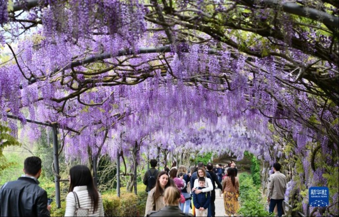 意大利佛罗伦萨巴尔迪尼花园近日紫藤花盛放,吸引众多游客前来观赏。