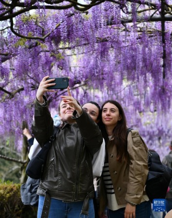4月24日,在意大利佛罗伦萨,游客在紫藤花旁自拍。新华社记者 金马梦妮 摄
