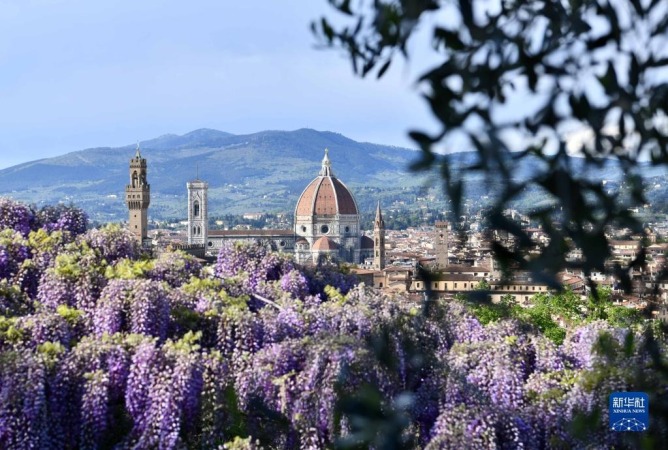 这是4月24日在意大利佛罗伦萨拍摄的紫藤花。新华社记者 金马梦妮 摄