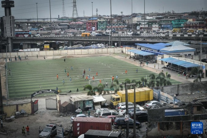 2月29日,人们在尼日利亚拉各斯的一处球场踢球。新华社记者 韩旭 摄