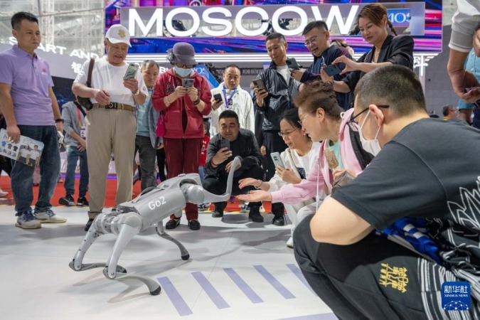 5月18日,参会者在第八届中俄博览会现场与机械狗互动。新华社记者 谢剑飞 摄