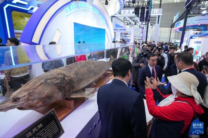 5月18日,参会者在佳木斯展区参观达氏鳇标本。新华社记者 王建威 摄