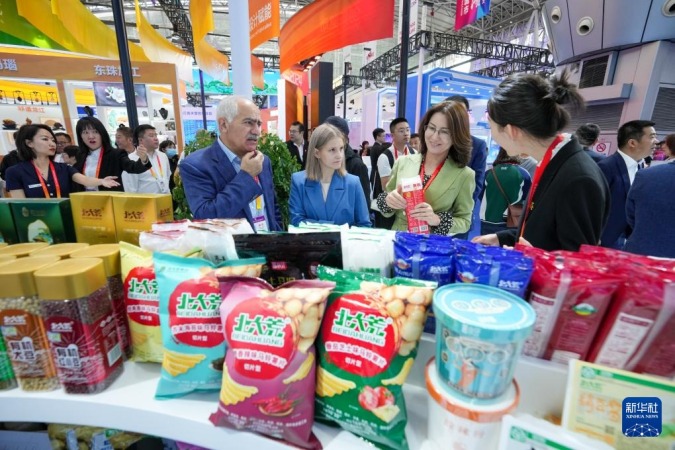 5月18日,几名俄罗斯客商在北大荒集团展区参观。新华社记者 王建威 摄