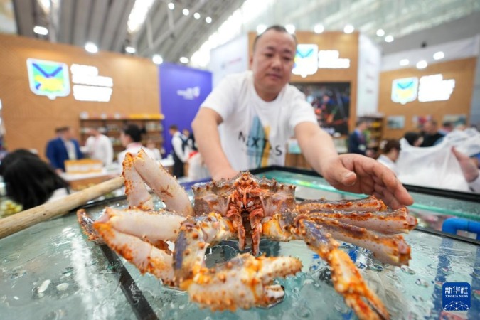 5月18日,一名参展商在展示俄罗斯帝王蟹。新华社记者 王建威 摄