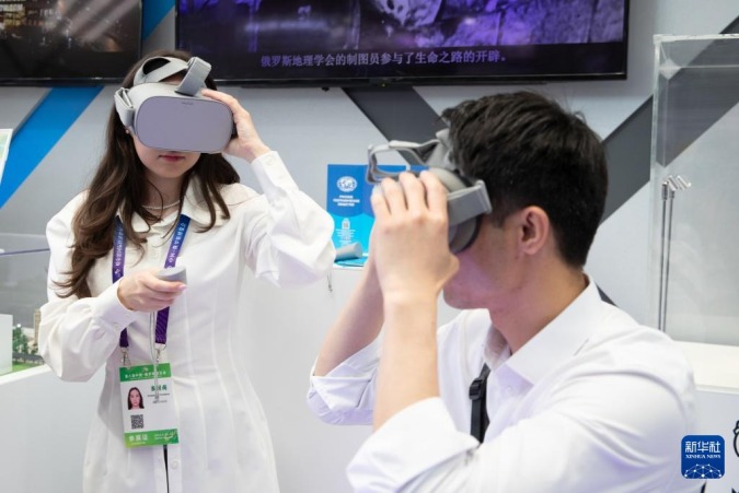 5月18日,在第八届中俄博览会现场,参会者通过VR技术观看俄罗斯生态风景。新华社记者 张涛 摄