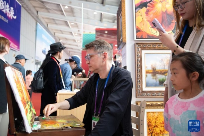 5月18日,一名俄罗斯画家在第八届中俄博览会现场进行创作。新华社记者 张涛 摄