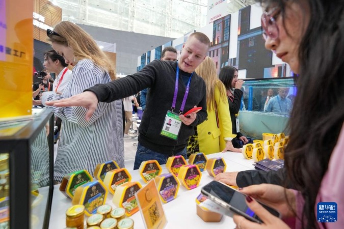5月18日,一名俄罗斯参展商(中)在介绍蜂蜜产品。新华社记者 王建威 摄