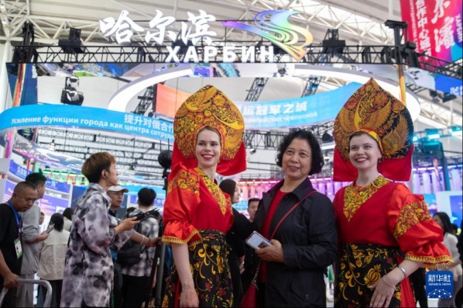 5月18日,在第八届中俄博览会现场,参会者与俄罗斯演员合影。新华社记者 张涛 摄