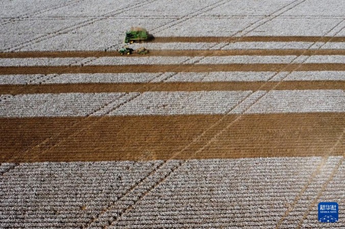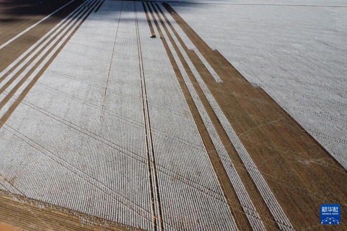 8月6日,在巴西戈亚斯州克里斯塔利娜,采棉机在棉田中作业(无人机照片)。新华社发(卢西奥·塔沃拉摄)