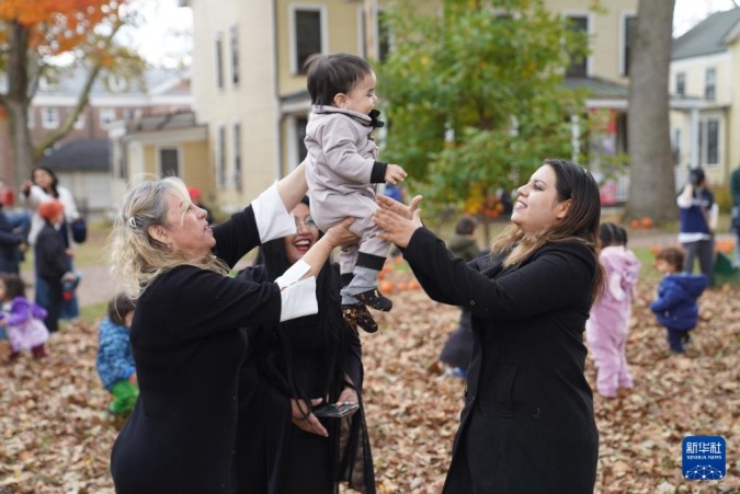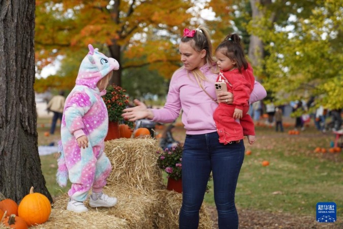 10月25日,在美国纽约总督岛,人们带着孩子参加秋日节。新华社记者 张凤国 摄