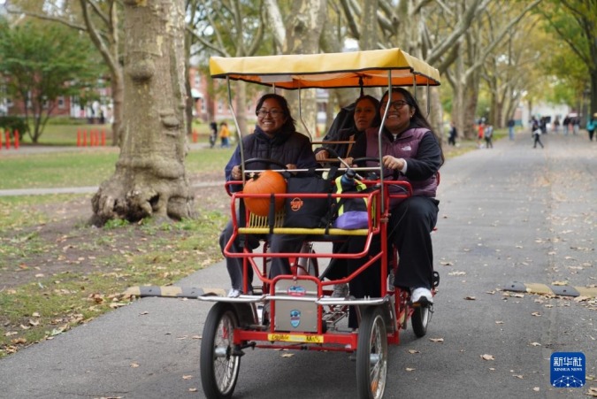 10月25日,在美国纽约总督岛,人们骑行在一条落叶大道上。新华社记者 张凤国 摄