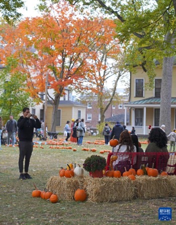 10月25日,在美国纽约总督岛,人们在秋日节上拍照留影。新华社记者 张凤国 摄