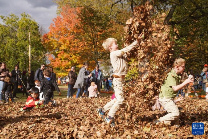 10月25日,在美国纽约总督岛,儿童在落叶中玩耍。新华社记者 张凤国 摄