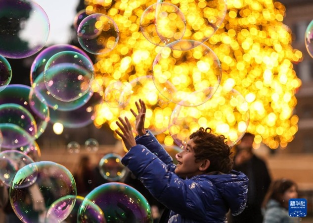 12月13日,小朋友在意大利首都罗马的人民广场玩泡泡。新华社记者 李京 摄