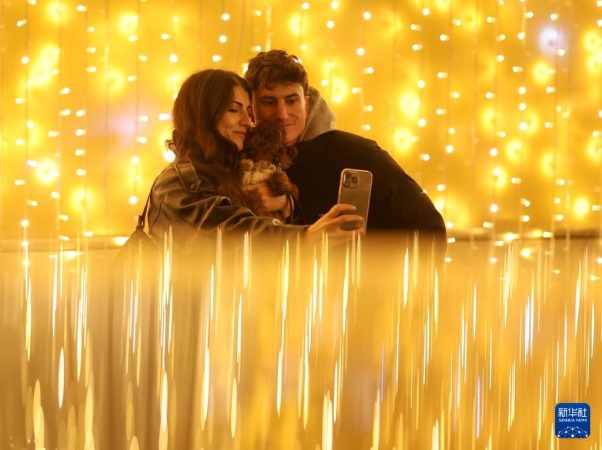 12月14日,一对情侣在意大利首都罗马市中心的科尔索大道附近与彩灯合影。新华社记者 李京 摄
