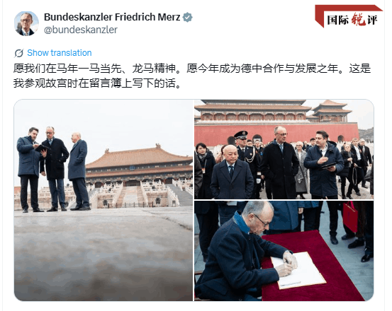 “愿我们在马年一马当先、龙马精神。愿今年成为德中合作与发展之年。”26日,德国总理默茨在社交媒体发帖,记录了他当天参观故宫时写下的祝福。作为近期欧洲政要访华潮中的最新一员,默茨在北京、杭州度过了充实的两天时光,收获了丰硕成果。《国际锐评》注意到,德国政府网站全程报道了这次访问,称“将深化中德战略伙伴关系”“推动双边合作走向更美好的未来”。随同默茨访华的德国企业纷纷表示,中国市场是它们赢利和创新关键所在,愿进一步扩大对华投资,共享中国式现代化发展机遇。