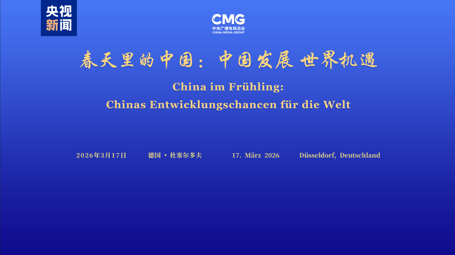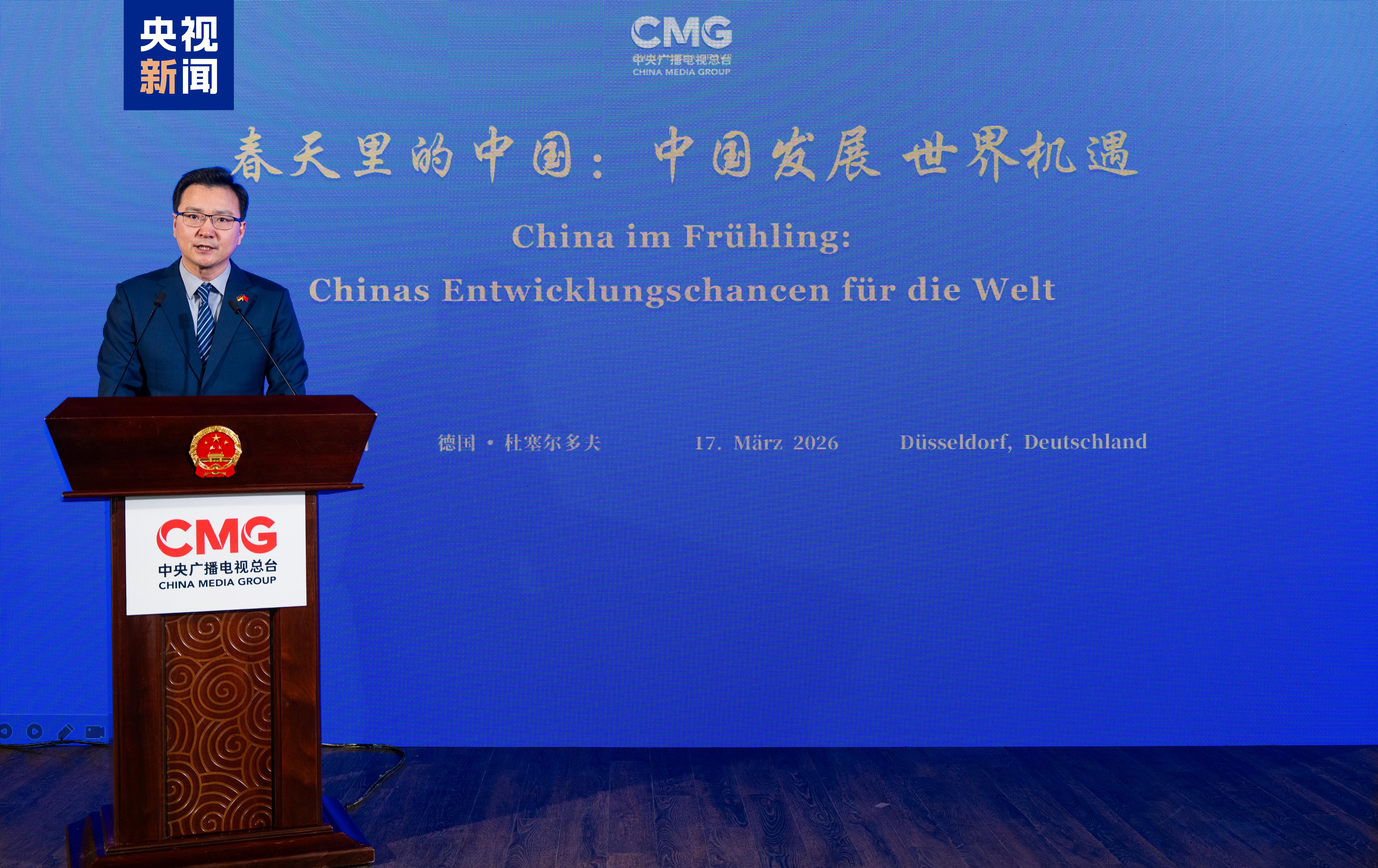 当地时间3月17日,由中国中央广播电视总台与中国驻杜塞尔多夫总领馆共同主办的“春天里的中国:中国发展 世界机遇”全球对话会德国专场在北莱茵-威斯特法伦州首府杜塞尔多夫举行。中宣部副部长、中央广播电视总台台长慎海雄作视频致辞。中国驻杜塞尔多夫总领事余勇、北莱茵-威斯特法伦州议会第一副议长施梅尔策、埃森市第一副市长雅各布出席活动并致辞。来自德国政界、工商界、学界、媒体界等百余位嘉宾参加活动。