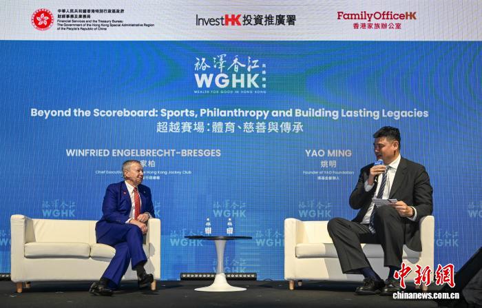 3月24日,2026年“裕泽香江”高峰论坛在香港举行。在“超越赛场:体育、慈善与传承”炉边对谈环节上,姚基金创始人、前NBA球星姚明(右)与香港赛马会行政总裁应家柏(左)就体育事业如何与公益慈善相辅相成,为社会带来正面影响展开交流。 (香港特区政府新闻处 供图)