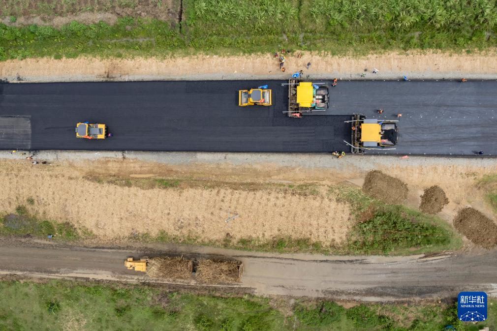 在施工现场,不同颜色的旗帜划分出各个施工区域,当地工人井然有序地进行沥青铺设,两侧的甘蔗田正值采伐丰收季,已经有大卡车满载甘蔗在修建好的路段上行驶。