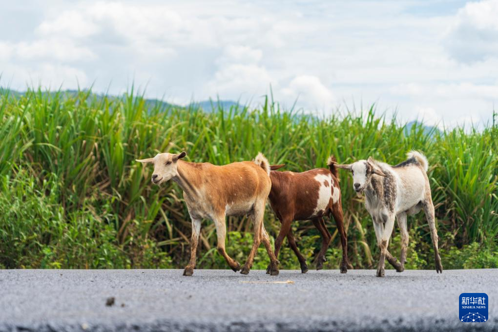 2月27日,在肯尼亚基苏木郡的甘蔗主产区,羊走在已修成的柏油路上。新华社记者 谢剑飞 摄