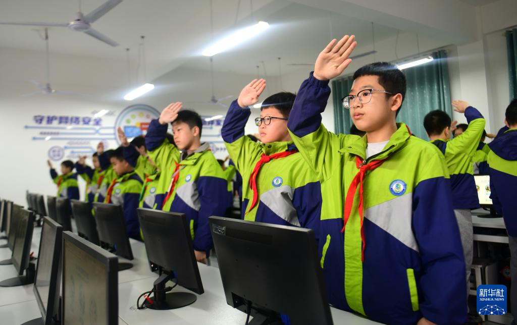 4月2日,在广西桂林市龙胜各族自治县龙胜镇第二小学,学生通过中国英烈网“网上祭英烈”平台向革命先烈网上献花后敬礼。