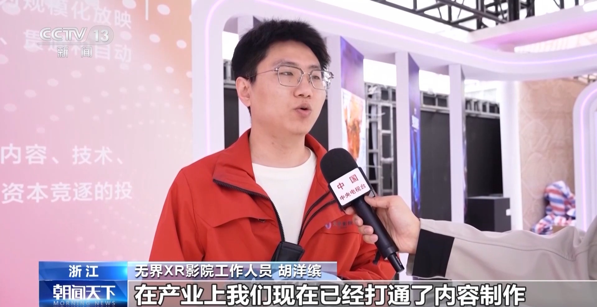 无界XR影院工作人员 胡洋缤:在产业上我们现在已经打通了内容制作、设备研发、影片发行以及院线管理一整套完整的产业链,目前已经有91台设备正式运行了。