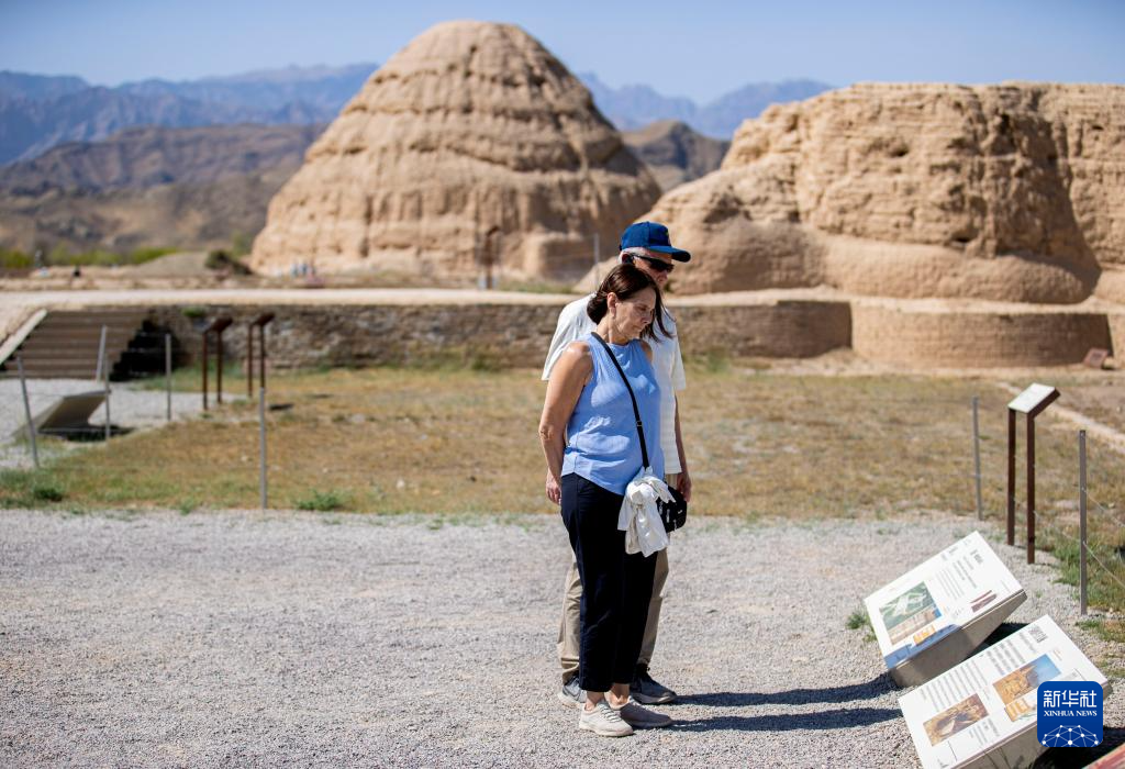 4月17日,中美“乒乓外交”亲历者朱迪·霍夫罗斯特(前)在宁夏银川市西夏陵景区参观。新华社记者 杨植森 摄