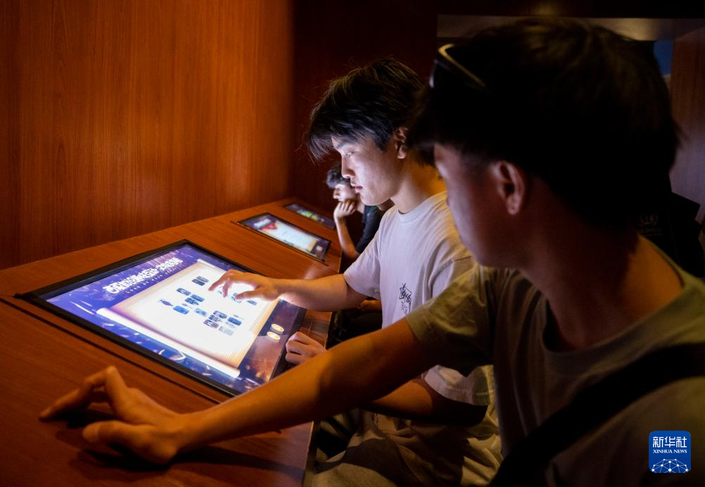 4月17日,美国青年乒乓球队队员在宁夏银川西夏陵博物馆内体验互动游戏。新华社记者 杨植森 摄