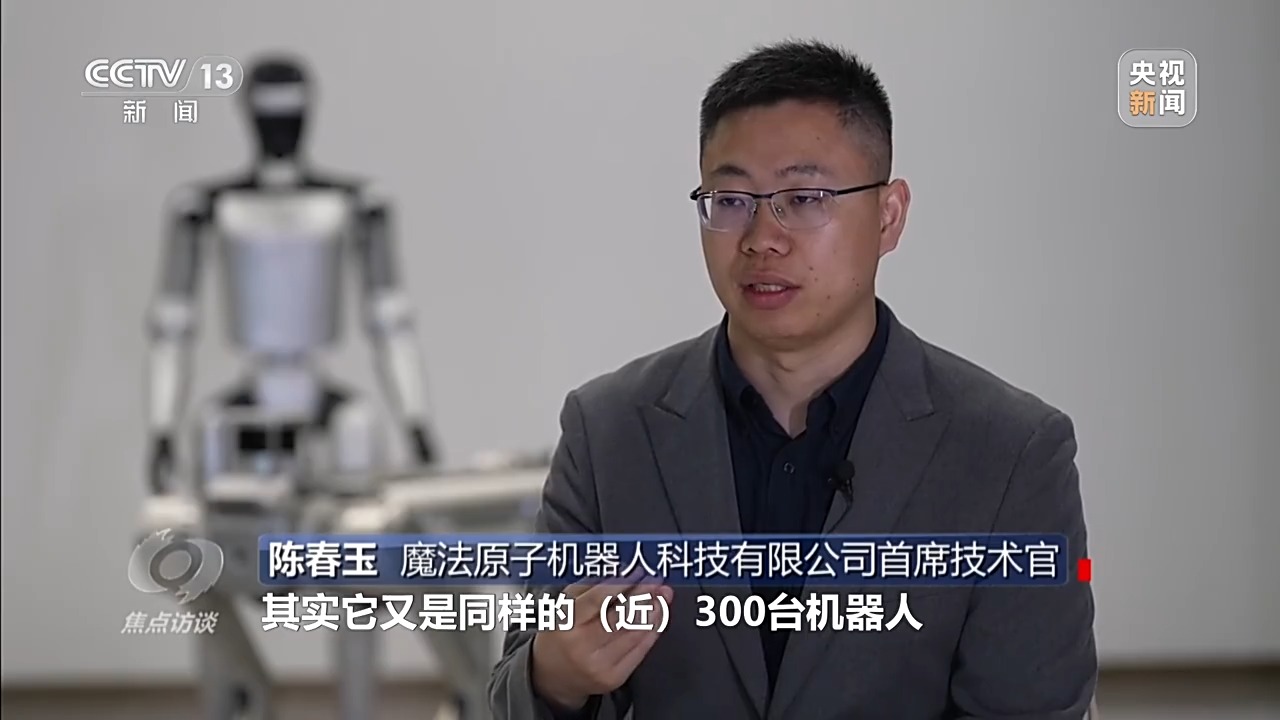 魔法原子机器人科技有限公司首席技术官 陈春玉:像我们在今年春晚看到上百台机器人熊猫扑面而来,有队形的变换。同时,苏超又是同样的近三百台机器人,这里面我们需要解决集群控制的情况下,个体和群体之间的互相运动,不要发生太多的碰撞,也是我们需要解决的困难。