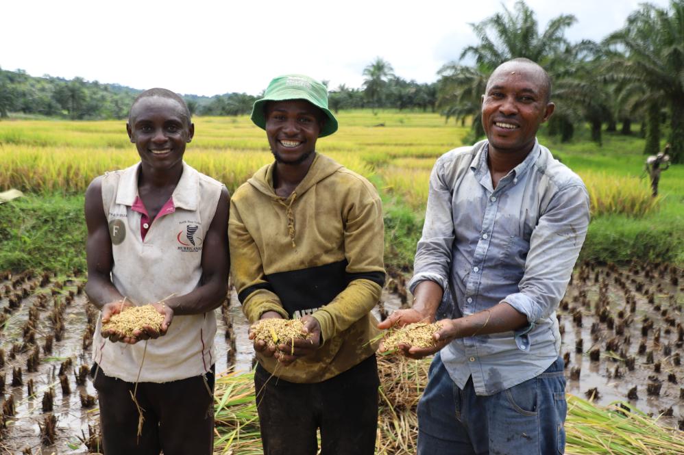 3月25日,在布隆迪布琼布拉省姆潘达县,当地农业技术员麦乐斯(右)与附近农户们手捧刚刚收获的稻粒。新华社记者 鞠银河 摄