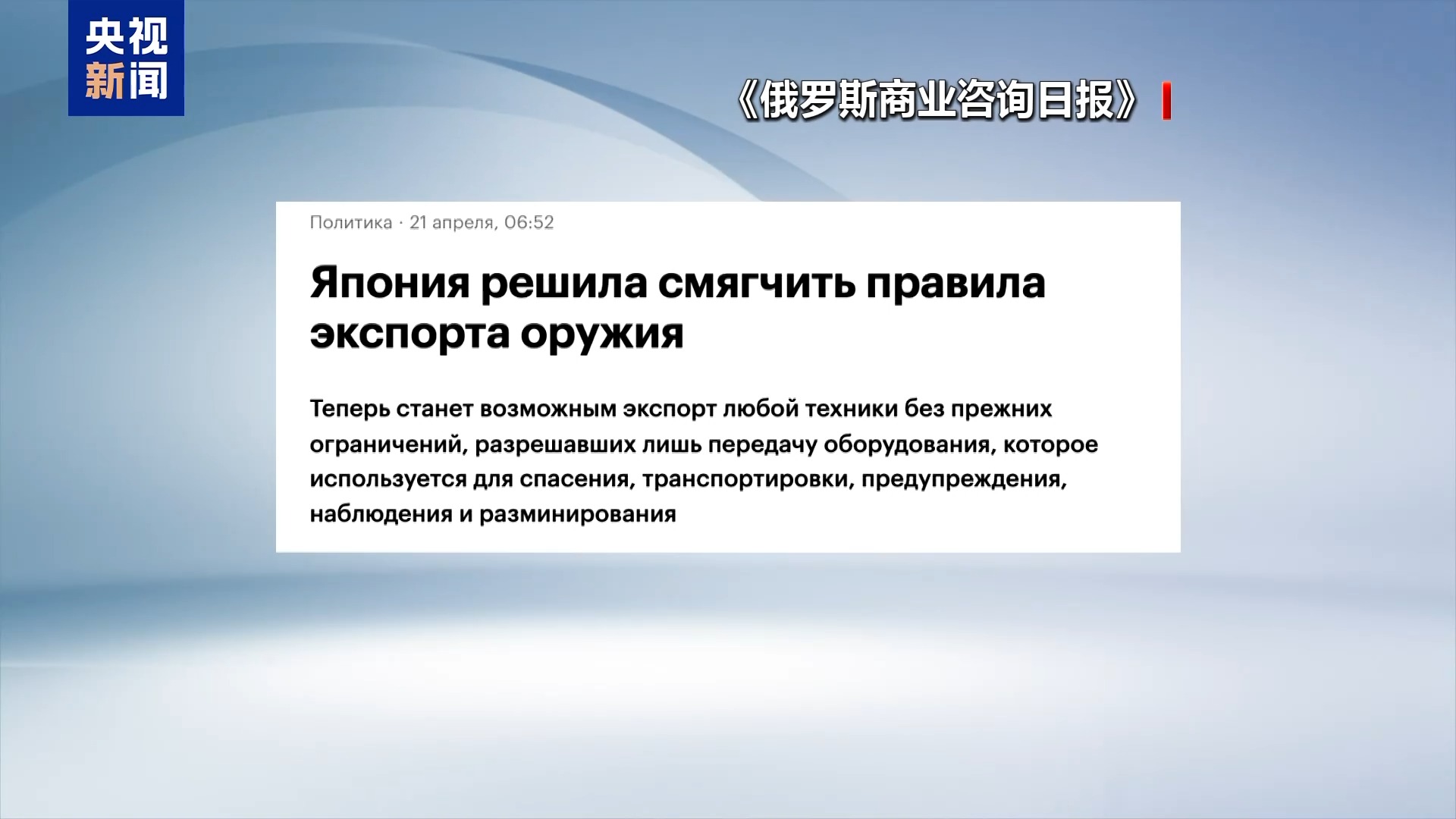 日本政府21日在内阁会议上正式修改了“防卫装备转移三原则”及其运用指南。部分俄罗斯媒体及周边地区的媒体对此表示高度关注。
